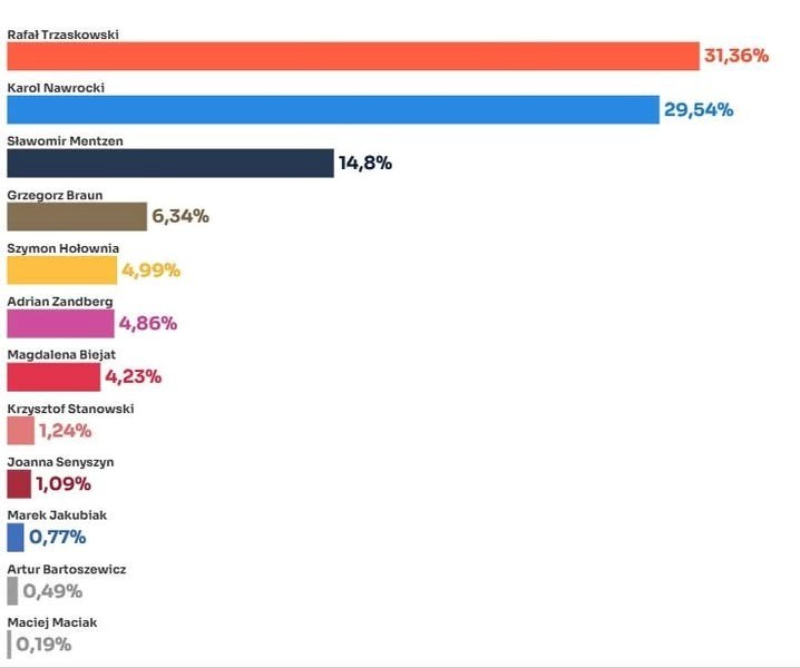 1. The duopoly between Law and Justice (Prawo i Sprawiedliwość, PiS) and Civic Coalition (Koalicja Obywatelska, KO) is weakened but not broken. Together Rafał Trzaskowski, KO (31%) and Karol Nawrocki, PiS (30%) gained slightly over 60% of the vote, the lowest since they started to dominate politics in the early 2000s. This is down from 73%, five years ago.